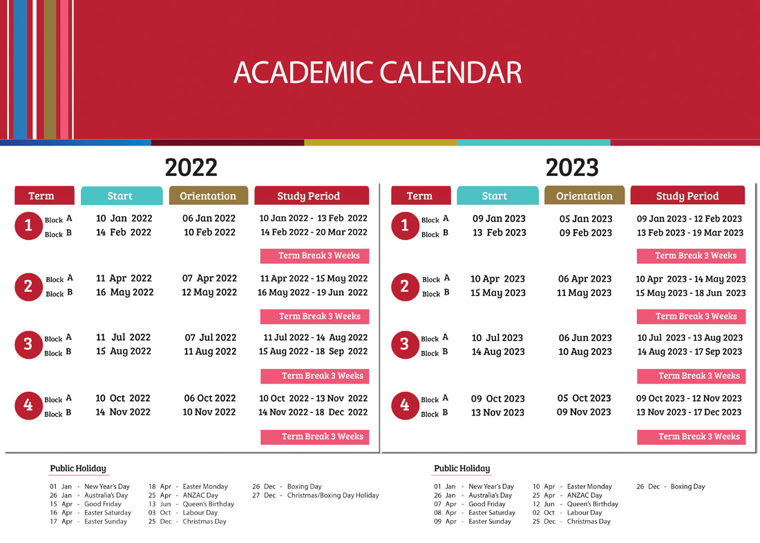 - Vocational Courses (Certificate to Advanced Diploma) dates below list for the commencement. Orientation takes place on the Thursday one week prior to commencement.